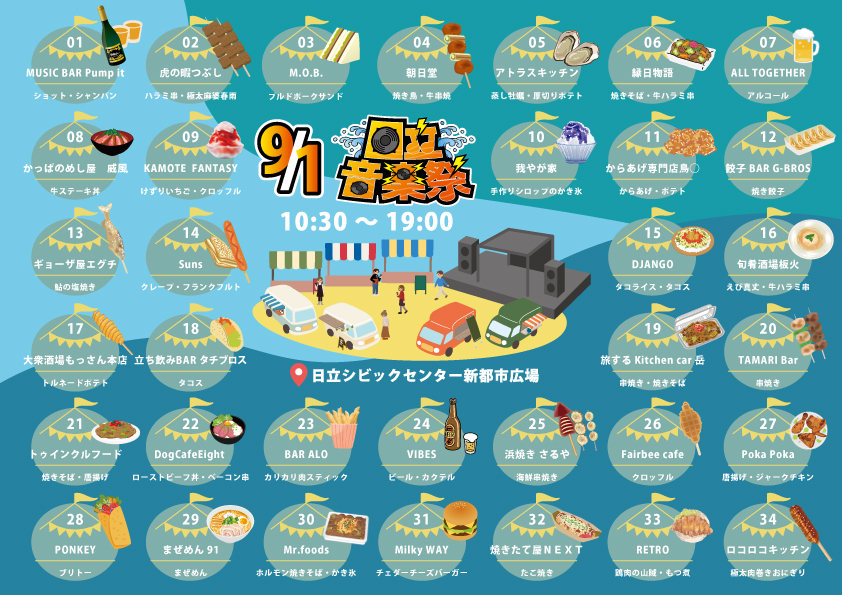 ホーム 全34店舗の飲食店一覧公開! 2024年8月1日2024年9月21日 SHARE ポスト シェア はてブ LINE ポスト シェア はてブ LINE 日立音楽祭に出店する飲食店の一覧を公開いたします。 当日は様々な飲食物が展開されますので、ぜひ全店舗回ってください!